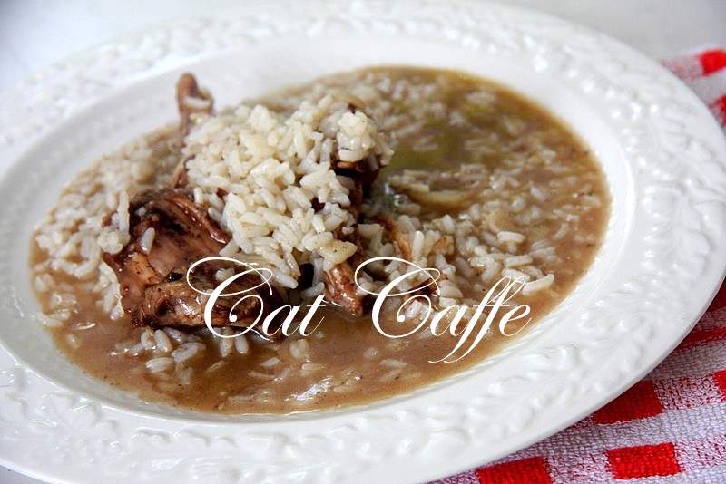 Como aqui em casa os coelhos existem em abundância, resolvi fazer um arroz de molho pardo. O normal é ser com galinha mas quem não tem cão caça com gato...Digo-vos que esta versão é também muito apetitosa. Ao matar o coelho aproveita-se o sangue e logo de seguida adiciona-se o vinagre. Corta-se em pedaços o coeolho e leva-se ao lume a refogar com um fio de azeite, as cebolas, os alhos e a folha de louro. Deixe tomar côre adicione o arroz. Deixe refogar mais um  pouco e adicione a àgua e o sangue com o vinagre. Tempere com sal e pimenta e deixe cozer o arroz. Rectifique os temperos e sempre que seja necessário adicione água a ferver. Cozinhe ate o arroz ficar bem macio mas com clada abundante. Sirva de imediato.